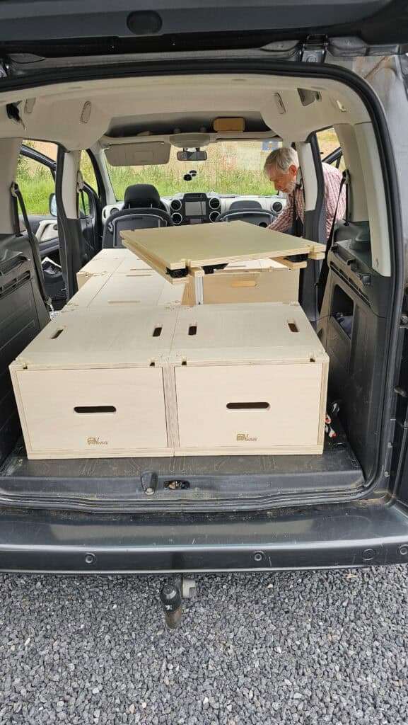 Le module se fixe directement dans le coffre du véhicule. La plupart des systèmes fonctionnent sans vis ni perçage. Tu peux donc installer ou retirer l’aménagement très facilement.